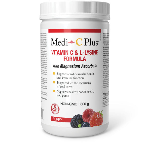 Medi-C Plus with Magnesium Ascorbate provides high doses of vitamin C and L-lysine, along with magnesium, to support cardiovascular health and immune function. These nutrients can help reduce the recurrence of cold sores, provide antioxidant support, and maintain bones, teeth, and gums. Vitamin C and lysine work together to build collagen, strengthening and holding the coronary artery cells together.